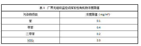 企業廠界無組織監控點揮發性有機物濃度限值應符合表3的規定。